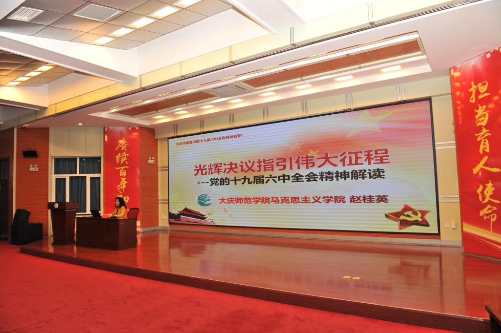 为深入贯彻落实党的十九届六中全会精神,按照省委教育工委《中共黑龙江省委关于深入学习贯彻党的十九届六中全会精神的决定》部署,公司扎实推进“六讲六做”宣讲活动。3月23日下午,大庆市委宣讲团成员、马克思主义公司党总支书记赵桂英在图书馆博雅讲堂作专题宣讲报告。党委宣传统战部主持会议。