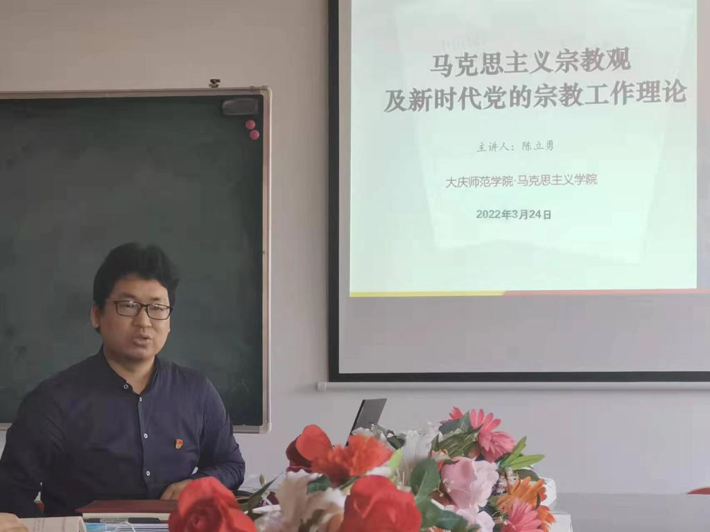 最后,宗教学专业硕士、市政协委员陈立勇同志作了题为《马克思主义宗教观及新时代党的宗教工作理论》的专题党课。这堂党课讲授了以下几个方面内容:一是阐释分析了马克思主义宗教观。这部分主要探讨了宗教的本质、宗教的根源、宗教的发展、宗教的消亡、宗教的作用以及马克思主义政党对待宗教的态度。二是解读了习近平总书记关于宗教工作的重要论述。这部分主要从坚持党对宗教工作的坚强领导、宗教工作的重要性、对待宗教工作必须坚持“导”的根本态度、坚持我国宗教的中国化方向、提高宗教工作法治化水平、宗教工作本质上是群众工作、坚持党的宗教工作基本方针、构建积极健康的宗教关系、支持宗教团体加强自身建设和人才培养几个方面进行讲授交流。在课程的最后,陈立勇主任谈了两点个人认识:一是加强理论学习,理直才能气壮;二是加强宣传教育,守护好党的思想阵地。与会的教职工都收获颇多,对宗教工作的认识有了更深刻更全面的认识。