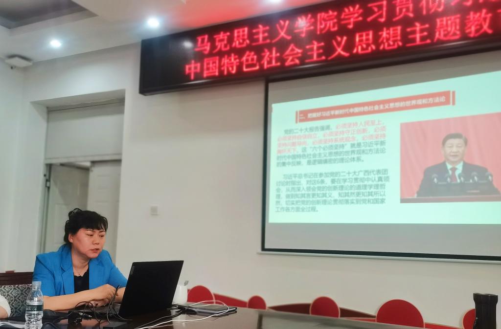 党总支书记赵桂英同志以《深刻理解 踏实践行“三个务必”》为题,从党的二十报告开篇习近平总书记提出的“三个务必”入手,围绕“三个务必”的历史定位和时代价值、理论依据和重大意义、使命担当和踏实践行等三个方面进行了讲授。赵桂英同志以生动详实的党史、新中国史、改革开放史和新时代十年的典型案例切入,从历史的纵向,深刻揭示出我们党百年成就与成功的密码就是十九届六中全会总结的“十个坚持”,而“三个务必”恰是其中的“三个坚持”--人民至上、艰苦奋斗、敢于斗争,这些认识对于公司《概论》课和《纲要》课的党员教师是一次理论提升与信念教育、品格融入课程的示范。在谈到理论依据时,赵桂英同志阐释了“三个务必”的“永恒课题和终身课题”、“光荣传统和优良作风”和“鲜明品格和精神特质”。学用结合,就此分析马院的优劣势、长短板,以“牢记教育初心、担当育人使命”、“谦虚谨慎为人、艰苦奋斗创新”、“增勇气强本领、敢于善于斗争”三个方面建议,强化思政课教师落实习近平总书记提出的“四有”好老师、“六要”思政课教师、“三为(人、事、学)”大先生、思想、政治、实践、专业“四练(炼)”要求和“八个相统一”的课程标准。