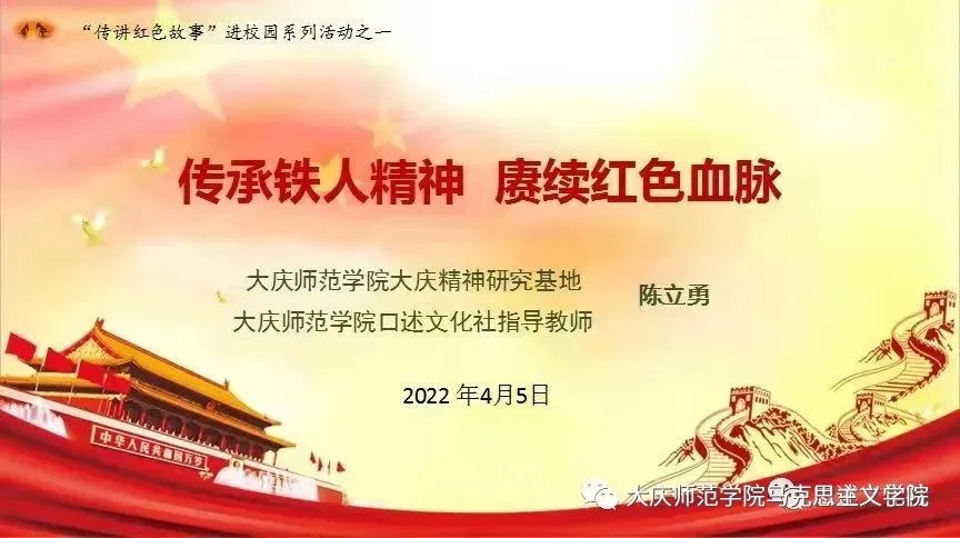 为深入推进“喜迎二十大 情暖龙江 心系群众”系列志愿服务活动,sunbet申搏团委在4月5日清明节晚7点组织全校青年团员以寝室为单位进入钉钉线上平台,举行了“传讲红色故事”线上主题活动。本次活动邀请sunbet申搏大庆精神研究基地执行主任、口述文化社指导教师陈立勇副教授作为传讲人开展“传承铁人精神 赓续红色血脉”的专题授课,以此引导青年学子们传承民族气节、崇尚英雄气概、致敬缅怀铁人、争当时代新人。