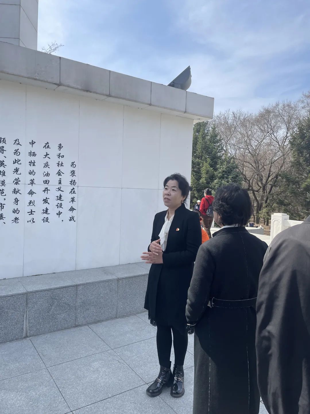 献花环节结束后,赵桂英向员工们生动讲解了肇州抗战故事,六烈士、抗联十二支队、电视剧《十三省》背景以及大庆这片土地上更早些时,杜蒙四子王旗民族团结、袁寿山将军抗俄献身的故事等。同学们听讲认真,对大庆这座城市有了更全新的理解。