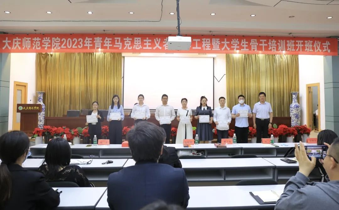 党委副书记徐晓东为2023年“青马工程”学员代表授旗,为本期培训班理论课教师代表、2022年“青马工程”优秀学员颁发聘书及荣誉证书,并对他们表示祝贺。