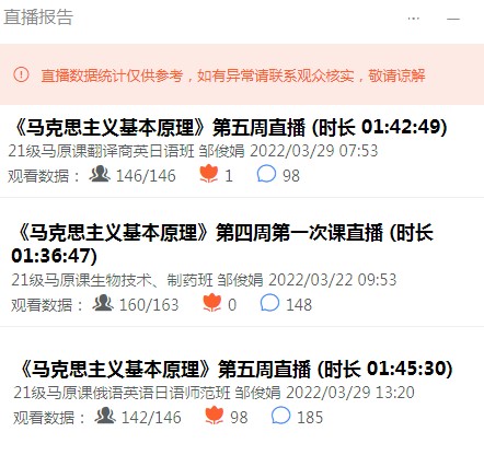 应势调整教学方案,让教学效果好起来。在因新冠疫情转为线上教学的情况下,为了更好实现入脑入心的教学目标,《原理》课程组通过集体备课充分研讨,及时调整教学计划,明确了由“线上线下混合式”转为线上直播教学的三个着力点:一是以员工为中心,精心设计线上直播教学的各环节;二是以线上教学特点为依据,打破教材章节限制,凝练教学专题内容。三是以自建线上平台资源为依托,将直播讲授与丰富的配套资料相结合,确保线上教学优质实施。