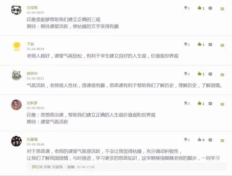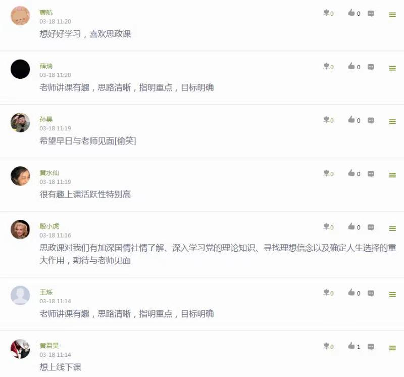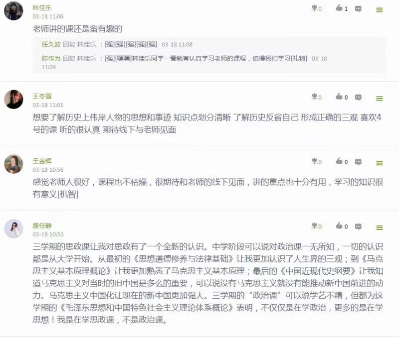 李世博(2020级网络工程专业二班):本来以为思政课会非常的枯燥乏味,但上了两节课后发现很有意思,现在非常期待线下课。老师的课堂气氛很活跃,不会让我觉得枯燥,充分调动积极性,让我们了解我国国情,与时俱进,学习更多的知识。