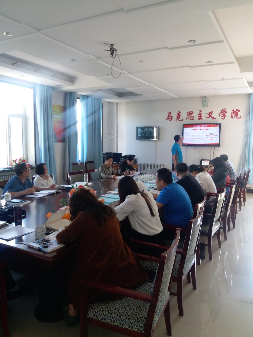 5月23日下午3:30,进行完集体政治理论学习及2018年度公司优秀共产党员推荐投票活动过后,马院的八位原理课授课教师继续在319会议室进行现场讲课、评课的多对一过课教学活动。