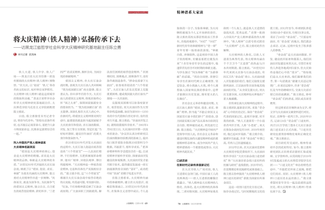 近日,公司黑龙江省哲学社会科学大庆精神研究基地副主任、sunbet副教授陈立勇作为红色文化研究专家接受人民日报《人民周刊》专访,就大庆精神(铁人精神)相关理论与实践问题展开系列解读。相关专访内容,以《将大庆精神(铁人精神)弘扬传承下去》为题发表在近日出版的《人民周刊》第9期“精神谱系大家谈”栏目中。