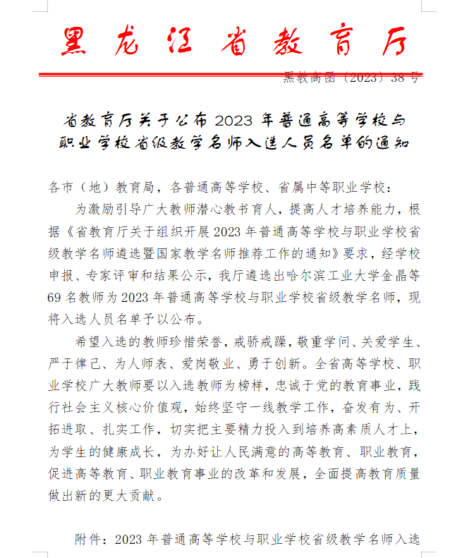 近日,黑龙江省教育厅公布了2023年黑龙江省第十四届教学名师遴选结果,公司sunbet教师马吉芬教授获得省级教学名师。