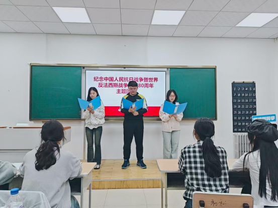 活动中,赵桂英书记从九月三日的阅兵作为开始,以中国共产党建党历程切入,系统梳理党在不同历史时期的奋斗脉络,重点讲述了中国人民抗日战争暨世界反法西斯战争的关键节点与伟大胜利,深刻阐释了“中国共产党是全民族抗战的中流砥柱”的历史逻辑。同时,结合青年团员的成长需求,她将历史与现实相衔接,引导团员从红色历史中汲取精神力量,明确新时代青年应肩负的责任与使命。宣讲结束后,同学们又朗诵了毛主席诗词《卜算子·咏梅》《沁园春·雪》《七律·长征》,表达自己对红色历史的深刻感悟、对革命先辈的崇敬之情,以及将历史精神转化为血液动力、主动担当新时代青年使命的坚定决心。