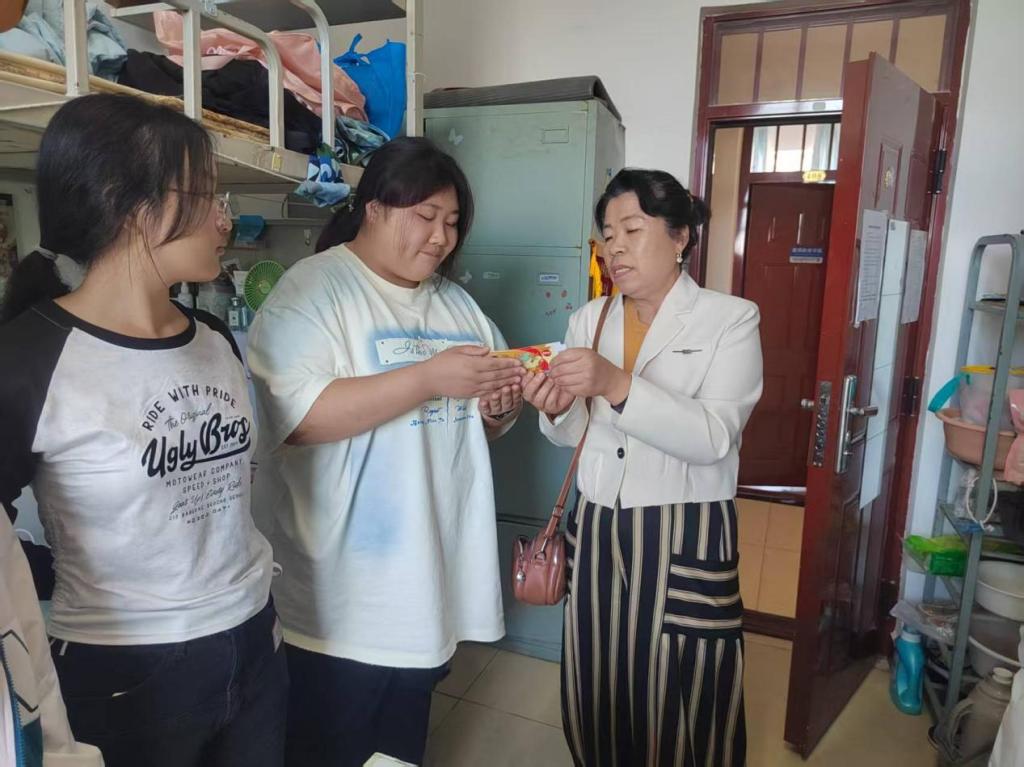 本次检查,重点围绕消防安全、用电安全及管制刀具三大核心维度展开。赵桂英书记强调:“寝室是员工在校期间学习生活的重要场所,安全是底线更是红线。全体员工要树牢‘安全第一’的意识,做好防火、用电安全,保障自身和他人的切身利益。”同时,赵书记还结合假期安全注意事项,向员工普及防盗防骗、出行安全、网络安全等知识,提醒员工离校前务必切断电源、锁好门窗,增强安全防范意识和自我保护能力。之后,赵书记还为假期留校的同学赠送了月饼券,叮嘱和关照留校员工假期作息和外出游玩的注意事项。